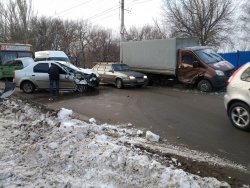 На фотографиях с места происшествия видно, что здесь столкнулись легковой автомобиль и грузовая "ГАЗель". У легковушки сильно разбит капот, а у "ГАЗели" смято левое крыло.