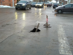 На предоставленных фото- и видеоматериалах видно, что глубокий провал на проезжей части появился на пересечении улиц Октябрьской и Челюскинцев. Кто-то уже обозначил опасный участок палкой с намотанной на нее сигнальной лентой.