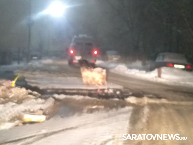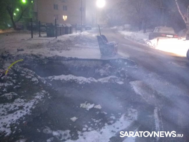 В Ленинском районе Саратова горожане выставили на проезжую часть кресло, чтобы водители не провалились в огромный котлован, вырытый у дома №10 на улице Моторной.