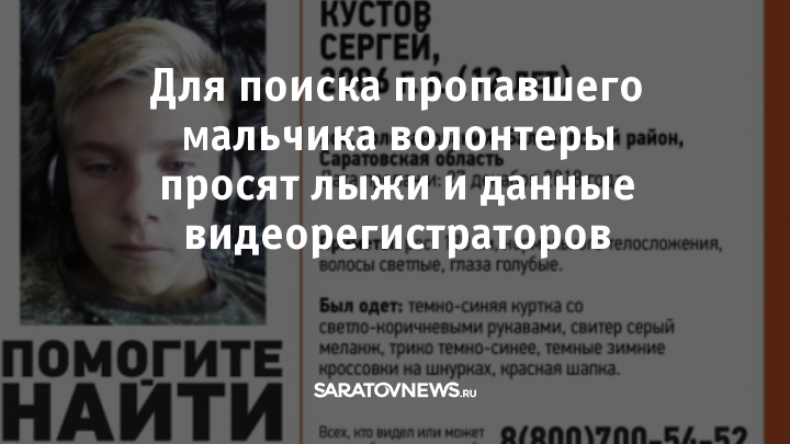 Поисковый отряд «Лиза алерт Саратов» обратился ко всем желающим с просьбой предоставить волонтерам лыжи и снегоступы для поисков 12-летнего Сергея Кустова. Также волонтеры призывают откликнуться водителей, которые проезжали 27 декабря с 10.30 до 22.00 по трассе от Маркса до Пугачева. Возможно, кадры со школьником попали на видеорегистраторы.