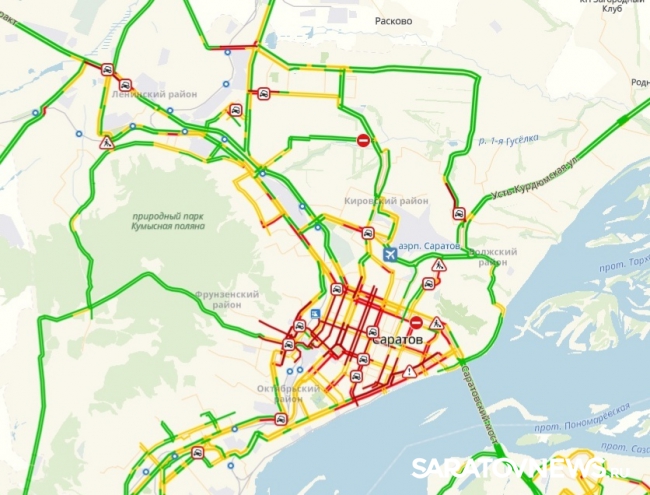 Затруднено движение по Соколовой (между улицей Рахова и 5-м Мурманским проездом), улицам Зарубина и Посадского (между улицами Рахова и Чапаева), улице Кутякова (между улицами Аткарской и Пугачева), улицеВавилова (между Университетской и Мирным переулком в обе стороны), Советской (между улицей Горького и Астраханской в обе стороны), улице Мичурина (Между Детским парком и Соборной), Рабочей (от улицы Емлютина до улицы Радищева), улице Серова (от 2-й Садовой до улицы Чапаева).