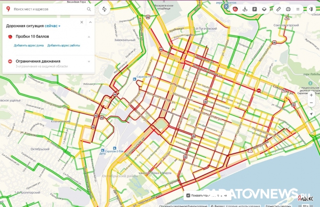 Сегодня, 16 января, еще до начала вечернего "часа пик" Саратов снова встал в десятибалльных пробках. В этом можно убедиться, посмотрел на карту "Яндекс. Пробок". основные магистрали в центре города обозначены красным цветом. Причиной очередного коллапса стал сильный снегопад, сопровождающийся ветром: дороги города сейчас буквально заметает.
