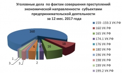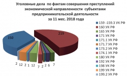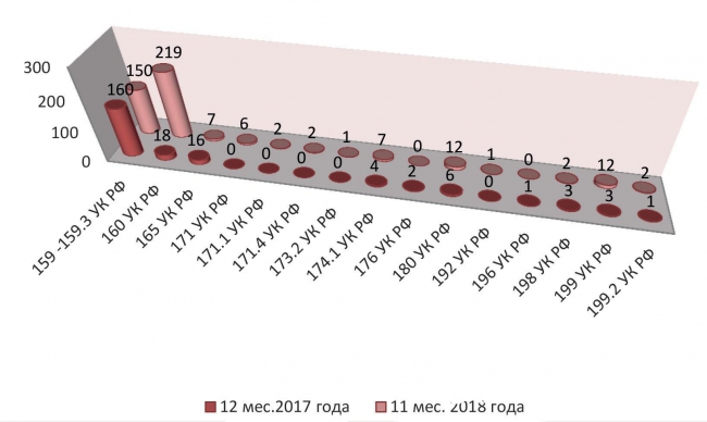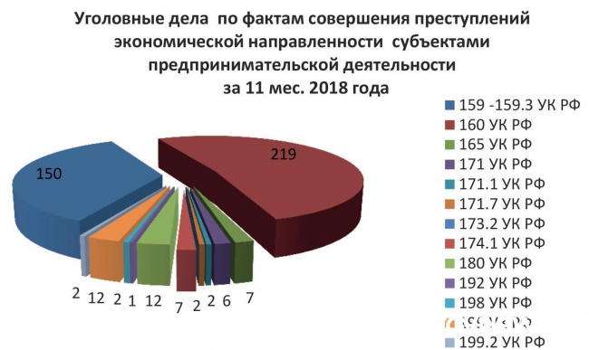 В докладе приведена статистика по числу уголовных дел экономической направленности. За весь позапрошлый год следственные орггны возбудили 214 дел по статьям о мошенничестве, присвоении или растрате, причинении имущественного ущерба путем обмана или злоупотребления доверием, незаконном предпринимательстве, обороте контрафакта, "шалостях" с документами при создании фирм, легализации преступных доходов, незаконном использовании чужих брендов, нарушениях в обороте драоценных металлов и камней, уклонении от уплаты налогов, сокрытии доходов от налогообложения. За январь-ноябрь прошлого года таких дел было 421. При этом больше половины из них - дела о присвоении или растратах: за 11 месяцев прошлого года их возбудили 219, больше половины от общего числа "экономических преступлений, тогда как в 2017-м дел по этой статье было лишь 18.