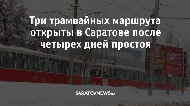 Сегодня, 29 января, в Саратове, возможно, запустят два трамвайных маршрута №№6 и 10, сообщает пресс-служба администрации Саратова. Это произойдет после очистки трамвайных путей. На данный момент, по данным мэрии, в Саратове ходят три трамвая: №№3, 9, 11. При этом, 9--й и 11-й несколько раз прерывали движение, но потом снова восстанавливали его.