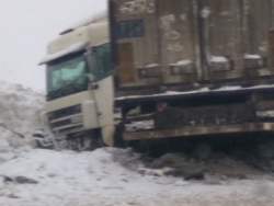 На фотографиях видно, что фура с полуприцепом буквально сложилась. Рядом с ней и в кабине никого нет.