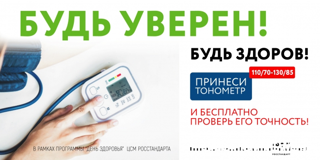 11 февраля 2019 года Федеральное агентство по техническому регулированию и метрологии проуело всероссийскую акцию «Будь уверен! Будь здоров!». Цель акции – донести до жителей России важность регулярной проверки бытовых тонометров артериального давления на точность показаний. В день акции приборы бесплатно проверили специалисты примерно 50 испытательных центров Росстандарта во всех федеральных округах.