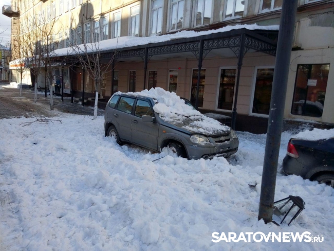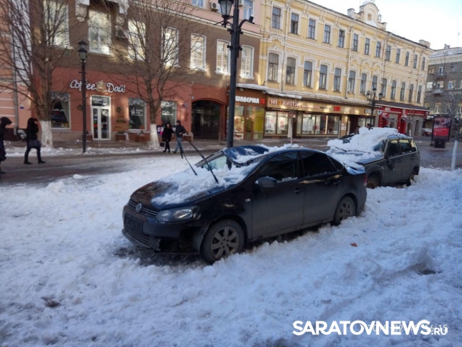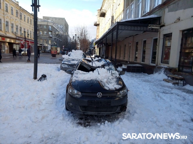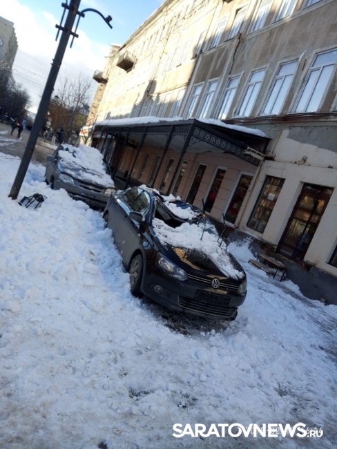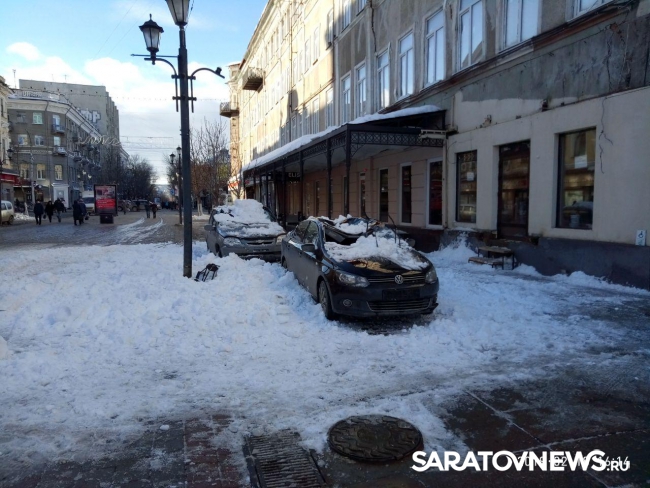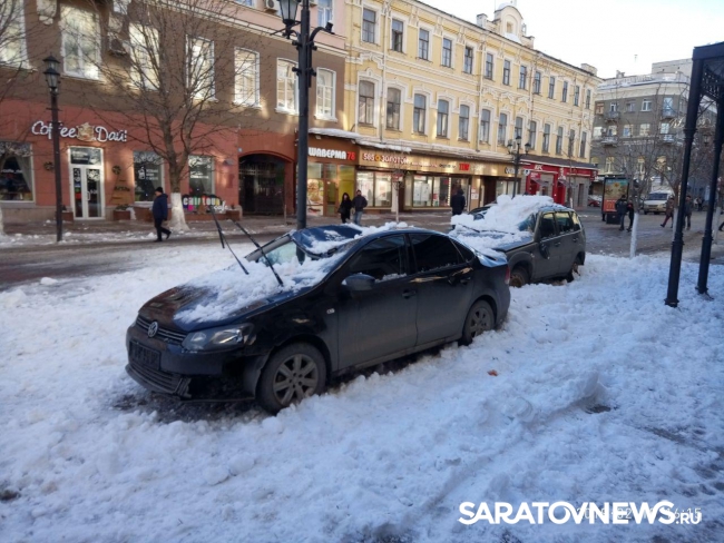 Сегодня на главной пешеходной зоне Саратова - на проспекте Кирова - снегом завалило две припаркованные машины. Корреспондент Saratovnews побывал на месте происшествия.