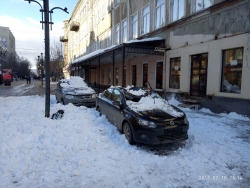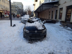 Инцидент произошел возле дома № 18. Снег сильно повредил крышу "Фольксвагена", на "Ниве Шевроле" повреждений не видно из-за того, что ее крыша засыпана снегом. Непонятно, сошел снег сам или его сбросили рабочие.