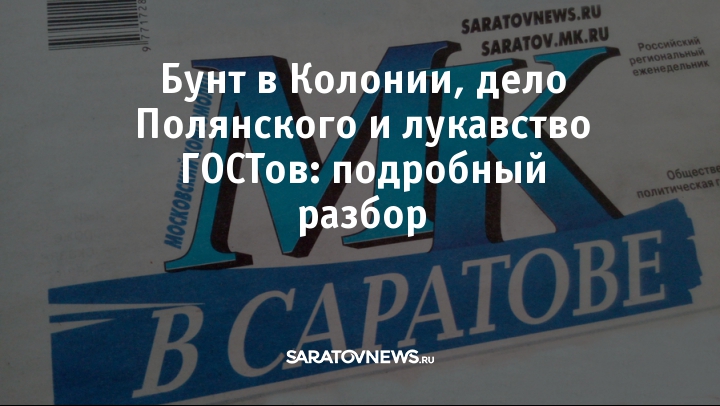Завтра, 20 февраля, выйдет очкередной номер "Мк в Саратове". Станислав Орленко подробно и со всех сторон расскажет о бунте в исправительной колонии № 7, Ирина Лихоман - о том, как производители продуктов обходят ГОСТы. В рейтинге скандалов от Елены Микиртичевой - дело Полянского, откровения осужденной за растрату экс-заведующей детским садом и не только.
