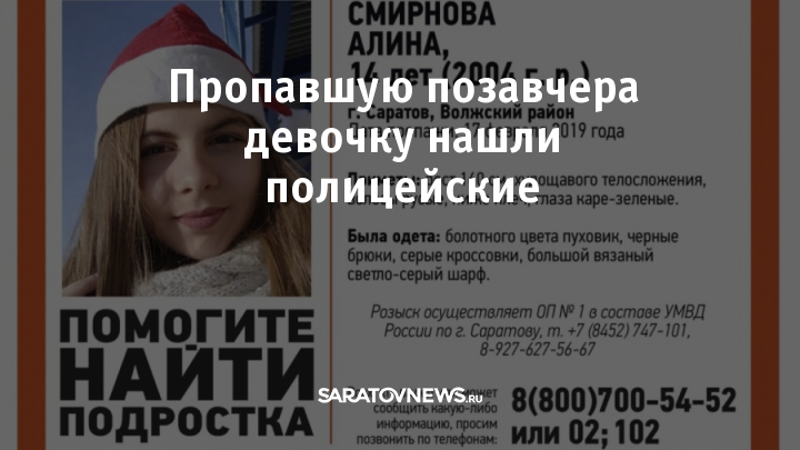 Пропавшую позавчера в Саратове 14-летнюю Алину Смирнову нашли полицейские. Некоторые подробности происшествия сообщила пресс-служба ГУ МВД по Саратовской области.