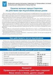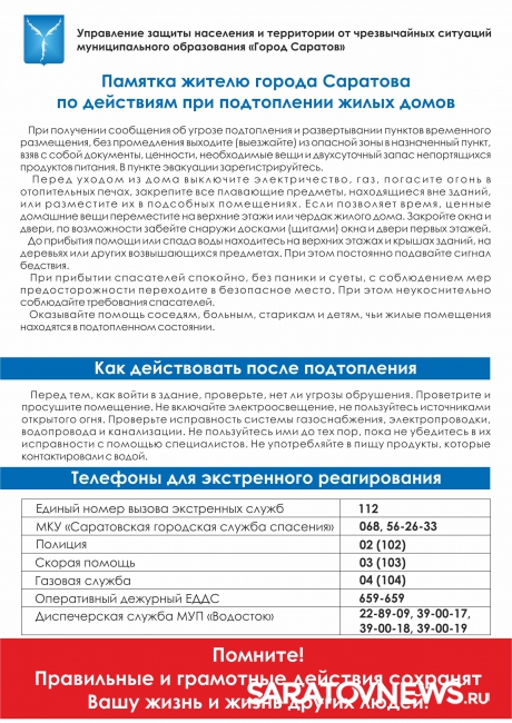 Саратовцам рассказали, как вести себя при паводке. Памятку от имени управления защиты населения и территории от чрезвычайных ситуаций распространила пресс-служба городской администрации. Большинство советов явно предназначены для частного сектора.