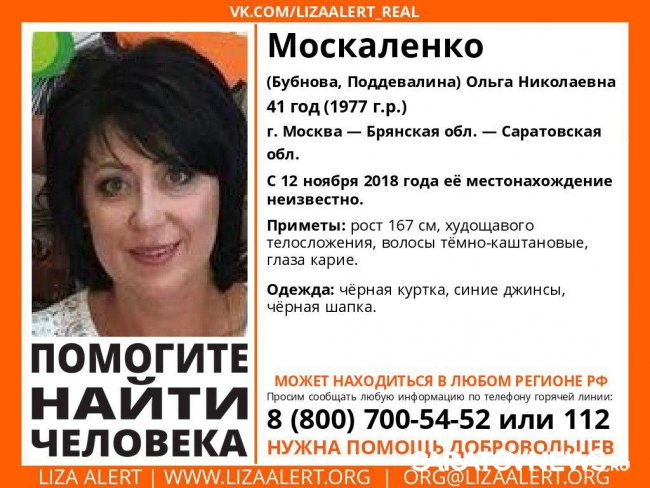По версии волонтеров поискового отряда, Москаленко может находиться в любом регионе России. Ее родственница во ВКонтакте сообщила, что женщина уехала на поезде в Москву, там вышла и пропала. Когда ее видели последний раз, она была одета в синие джинсы, черные куртку и шапку. С собой у Ольги были сумка и черный пакет. Приметы: рост - 167 сантиметров, худощавая, темно-каштановые волосы, карие глаза. Поисковики уточнили, что она может фигурировать под фамилиями Бубнова или Поддевалина.