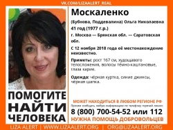 В Москве, Саратовской и Брянской областях ищут 41-летнюю Ольгу Москаленко. Женщина 12 ноября 2018 года уехала из Балакова через Москву в Брянскую область и родные потеряли ее. Информацию о пропаже Ольги распространили волонтеры группы "Лиза Алерт Саратов" и ее родственники.