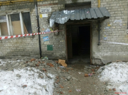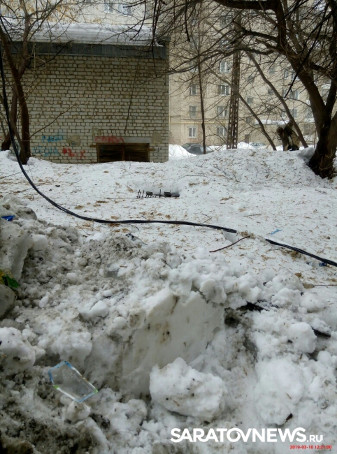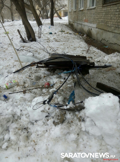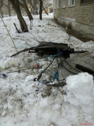 Свой пост мужчина подкрепил сделанными сегодня фотографиями. На них видно, что рухнули перила балкона на пятом этаже, по снегу растянулся силовой кабель. Это произошло возле подъезда № 1, козырек которого согнуло чем-то упавшим сверху.