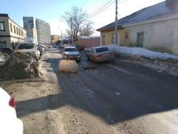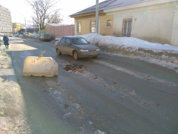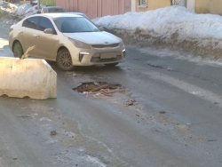 Перекосившийся колодец на дороге появился рядом с одним из зданий института МВД, недалеко от Большой Горной. Крышка люка сдвинута. Она когда-то была прикрыта деревянной палетой, но ее, похоже, уже несколько раз переехали невнимательные водители - поддон разбит в щепки. Рядом с люком есть ограждение, но оно не загораживает место провала - его тоже сдвинули в сторону.