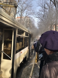 О происшествии в социальных сетях сообщили очевидцы. Сейчас вагон потушили, но восстановить движение трамваев не удалось.