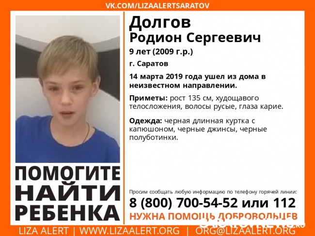Вчера в Ленинском районе ушел из дома и не вернулся 9-летний Родион Долгов. Волонтеры "Лиза Алерт Саратов" объявили поиски мальчика.