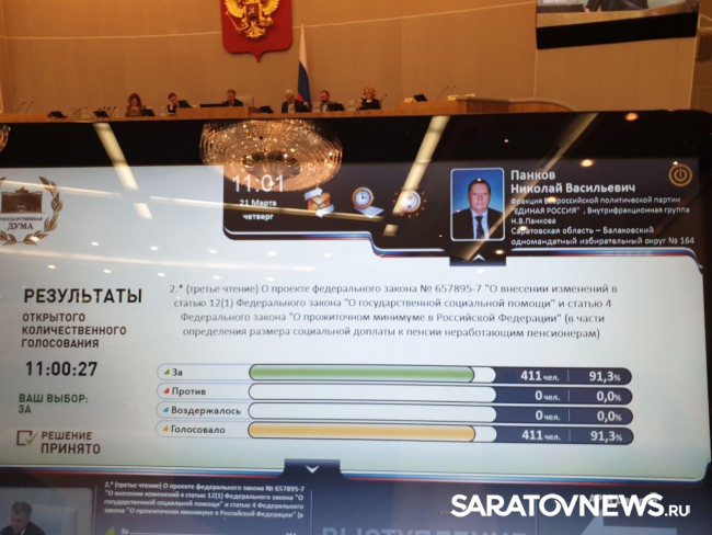 Сегодня Государственная Дума приняла закон, направленный на индексацию пенсий сверх прожиточного минимума. Об этом в своем телеграм-канале «Пара слов» рассказал секретарь Саратовского регионального отделения «Единой России», депутат Госдумы Николай Панков.