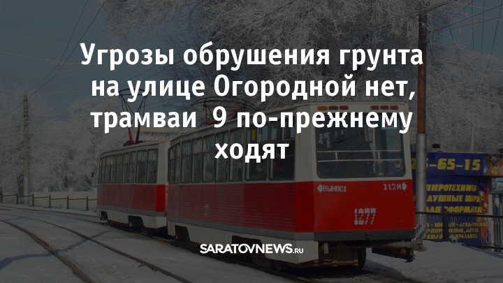 Закрывать трамвай № 9 из-за обрушения грунта, о чем ранее сообщали представители "Саратовгорэлектротранса", не будут. Сейчас он продолжает работать в штатном режиме. Представители ООО «Концессии водоснабжения - Саратов» уточнили, что угрозы проседания в районе рельсов на улице Огородной не обнаружено.