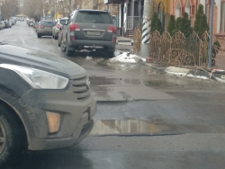 По словам автора снимков, асфальт просел на проезжей части рядом с коммунальным колодцем. Глубина ямы - примерно 30-40 сантиметров, площадь - больше двух метров. Асфальт не провалился, а именно просел, в котловине скопилась талая вода.