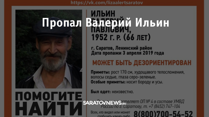 В Ленинском районе Саратова пропал Валерий Ильин. 66-летнего мужчину ищут с 3 апреля. Объявление о его розыске опубликовали волонтеры поискового отряда "Лиза Алерт Саратов" ВКонтакте. Автор ориентировки уточнил: мужчина может быть дезориентирован.