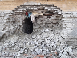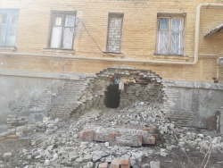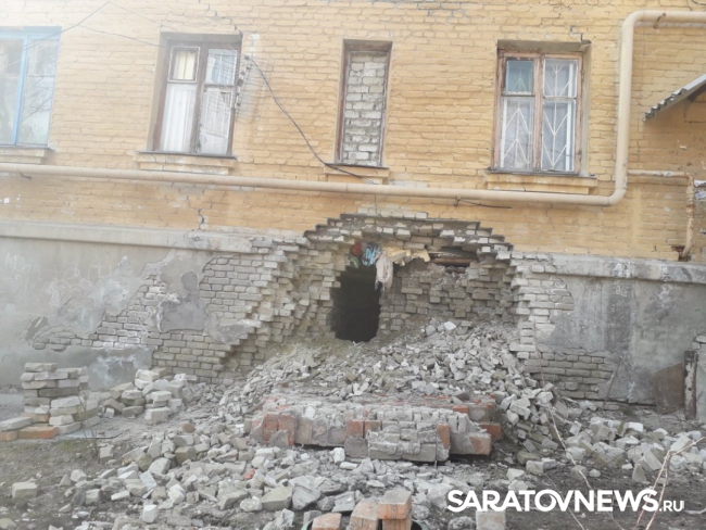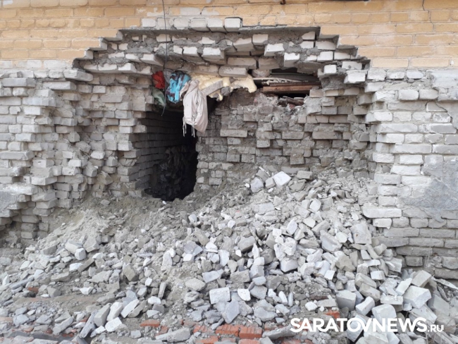 Стену двухэтажного дома № 21 на улице Хомяковой в Саратове кто-то пробил насквозь. Фотографии дыры размером в половину стандартного окна в цоколе здания появились в соцсетях вчера. На снимках видно, что из отверстия вывалились кирпичи, над ним закреплены какие-то тряпки.