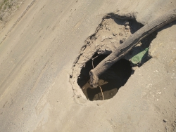 Видео и фотографии в редакцию прислал водитель. Мужчина рассказал, что яма на улице Безымянной мешает водителям уже несколько недель. Действительно, на присланных им кадрах можно увидеть, что вокруг провала, который образовался в том ряду, что ведет к Ботаническому саду, уже проторена дорога по встречной полосе. Иначе объехать яму невозможно. Свежие отпечатки протекторов отчетливо выделяются на фоне толстого слоя дорожной пыли, а сама яма почти метровой глубины залита грязью, видимо, смытой с дороги дождями и талыми водами.