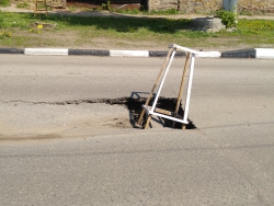 Деревянный полуконус, видимо, сколоченный для того, чтобы защищать маленькие деревца, теперь отмечает очередную ловушку на дороге. Он стоит прямо напротив морга 2-й городской больницы Саратова, вызывая у тех, кто его видит, странные ассоциации.