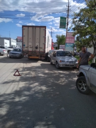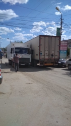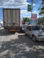 Столкнувшиеся машины остановились так, что мимо них с трудом проезжают даже легковые машины, не говоря уже о грузовом транспорте. Рядом с местом происшествия в обоих направлениях начинает собираться затор.