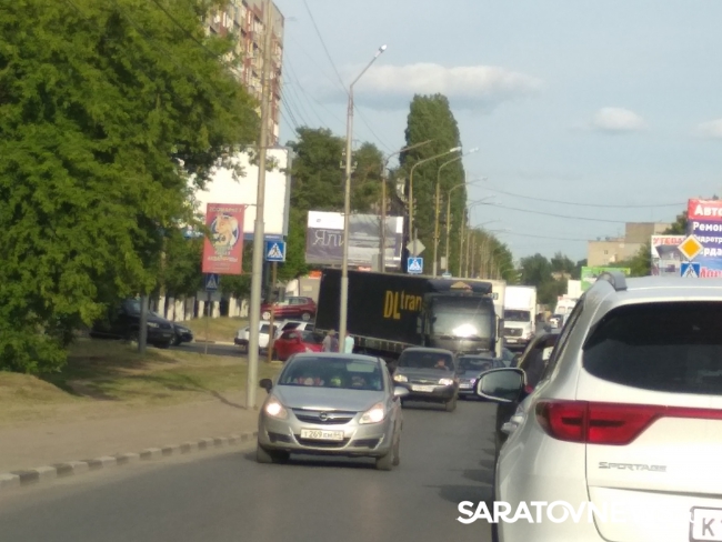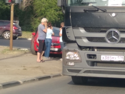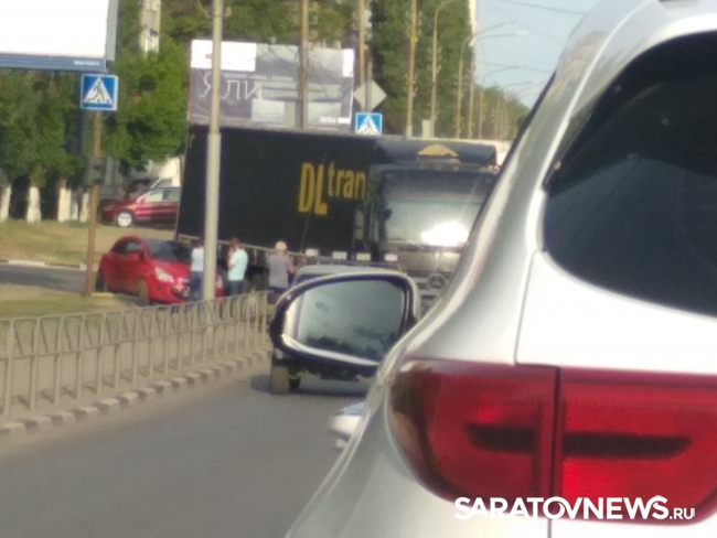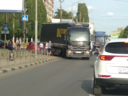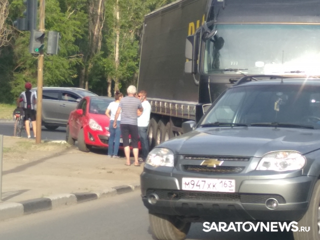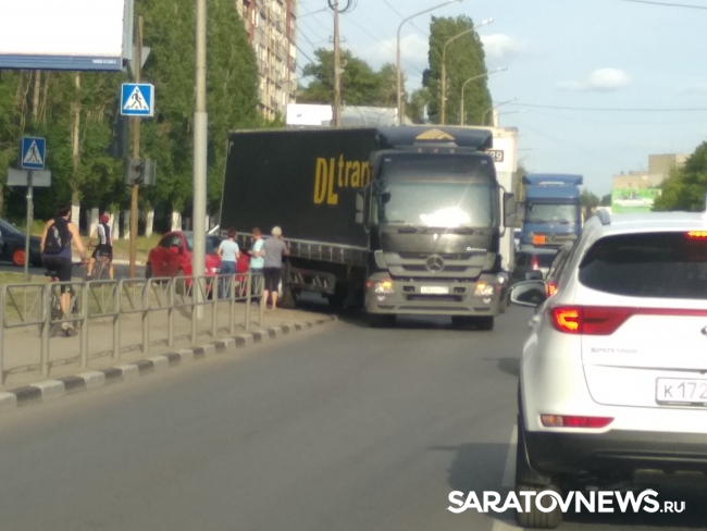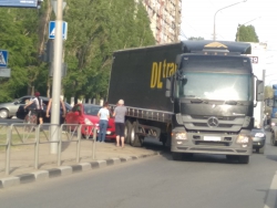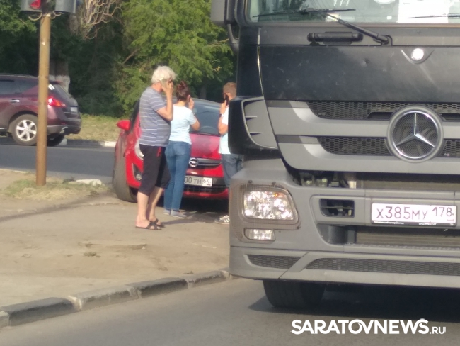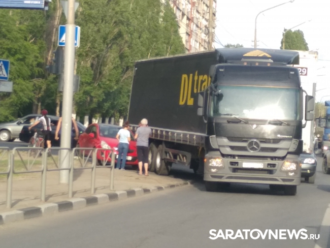 Фура Mercedes с номерами Санкт-Петербурга вытолкнула на тротуар малолитражный "Опель". Инцидент произошел вчера вечером в Кировском районе Саратова, фотографии с места происшествия в редакцию Saratovnews прислал очевидец.