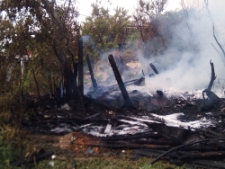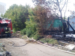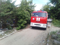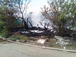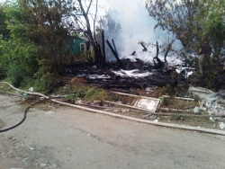 Дом - одноэтажный, деревянный, он уже довольно давно расселен и пустует. Пожар начался внутри. Один из очевидцев рассказал, что это произошло примерно 45 минут назад. Два пожарных расчета прибыли на место происшествия довольно быстро, через 12-15 минут после начала пожара. Сейчас огонь практически потушен, пожарные проливают место происшествия - от постройки фактически осталась лишь груда горелых бревен.