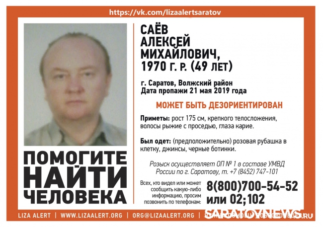 В Волжском районе Саратова без вести пропал 49-летний Алексей Саёв. Об этом сообщили волонтеры поискового отряда «Лиза Алерт Саратов». Объявление о поиске человека обнародовано ВКонтакте.