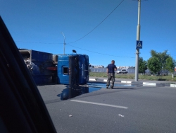По свидетельству очевидцев, водитель КамАЗа не справился с управлением, из-за чего большегруз завалился набок. Содержимое грузовика высыпалось на дорогу.