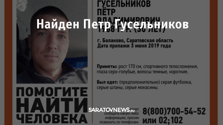 Пропавший 3 июня в Балакове Пётр Гусельников нашелся живым. Об этом в группе «Лиза Алерт Саратов» ВКонтакте сообщили представители отряда.
