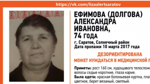 Напомним, Александра Ефимова пропала 10 марта 2017 года в посёлке Солнечный Саратова. На момент пропажи ей было 74 года.