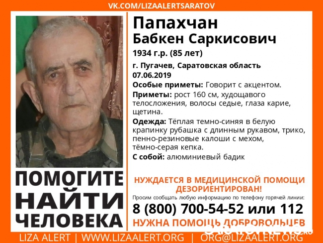 В Пугачёве Саратовской области без вести пропал 85-летний Бабкен Папахчан. Престарелого мужчину потеряли 7 июня 2019 года, об этом сообщили волонтеры поискового отряда «Лиза Алерт Саратов».
