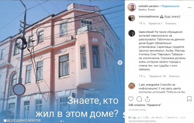 «На такие обращения жителей невозможно не реагировать! Табличка на данном доме будет обязательно установлена. Саратовцы гордятся своими земляками, Актёр, Мастер, Учитель Олег Табаков — не исключение. Горожане должны знать историю своего города и имена тех, чьи судьбы с ним связаны», — написал он в ответ.