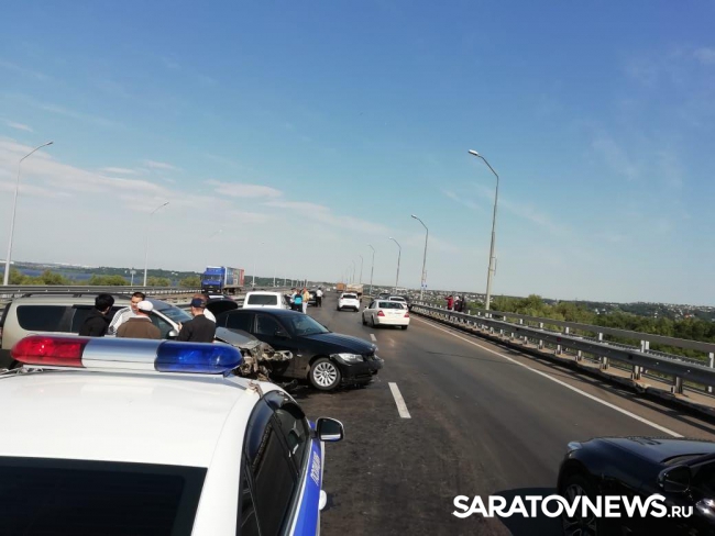 По предварительным данным, на коротком участке столкнулись 10 легковых автомобилей. В ДТП никто не пострадал, но на мосту в сторону Саратова образовалась большая пробка. Сейчас на месте ДТП работают сотрудники ГИБДД, которые пытаются открыть движение по мосту.