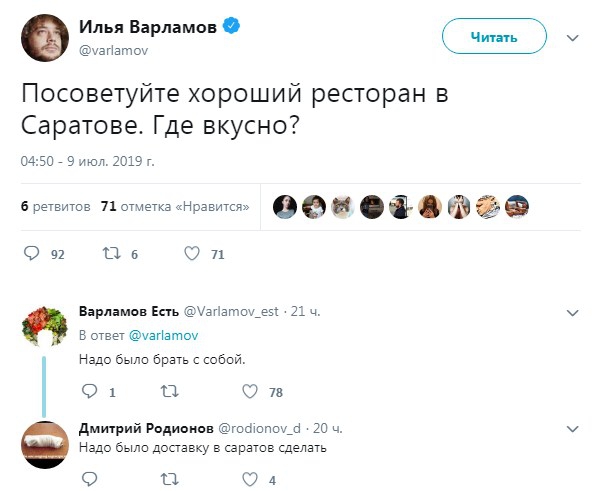 В Twitter-аккаунте Ильи Варламова появилась фотография с молодой саратовчанкой на Волжской. Чуть ранее, вечером во вторник, 9 июля, он интересовался у своих подписчиков, где в Саратове найти хороший ресторан.