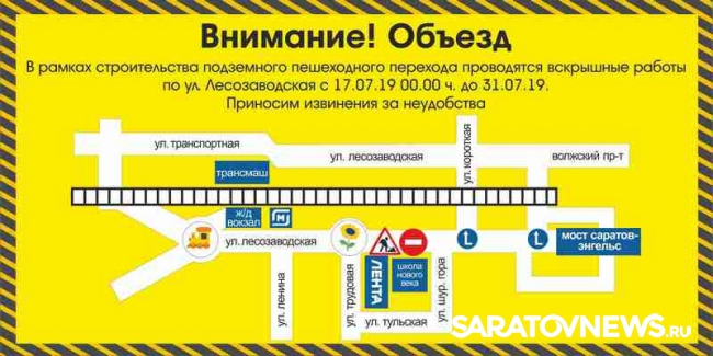 Напомним, проезд по Лесозаводской для строительства подземного перехода к «Школе нового века» должен был закрыться в полночь 16 июля. Автолюбителям на время перекрытия улицы было предложено три варианта объездов по по нижней дороге улицы Лесозаводской, по улице Тульской через микрорайон Шурова гора, или через село Пристанное и новый мост через Волгу.