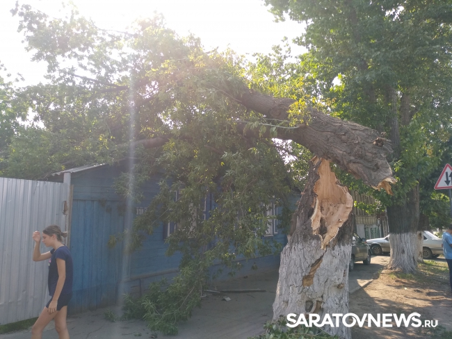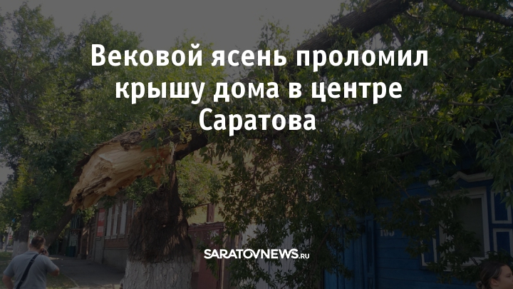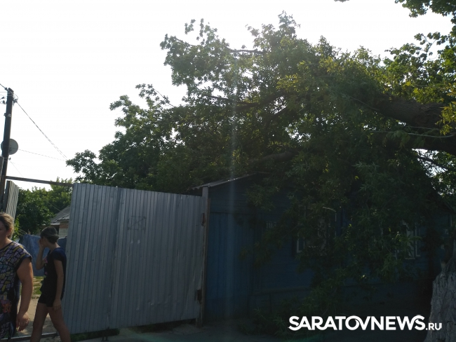 Примерно час назад в центре Саратова, на улице Соколовой огромный ясень рухнул на крышу частного дома. Последствия происшествия сфотографировал корреспондент SaratovNews.