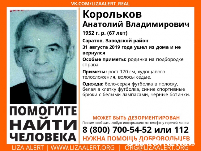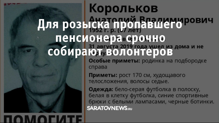 Волонтеры поискового отряда «Лиза Алерт Саратов» формируют группу для розыска пропавшего пенсионера из Заводского района Саратова Анатолия Королькова, сообщается в официальном сообществе отряда в социальных сетях.