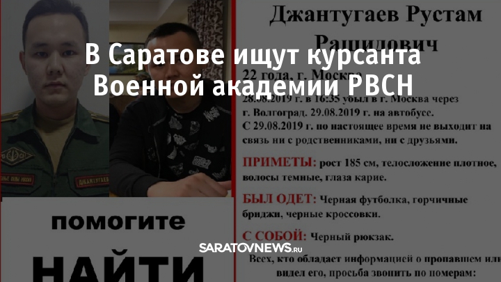 Как сообщили SaratovNews в УМВД по Астраханской области, курсанту 22 года. После летних каникул он ехал на перекладных из Астрахани через Волгоград и Саратов в Москву. В последний раз Рустама Джантугаева видели 30 августа в 22:00 вечера на саратовском вокзале. Парень был одет в черную футболку, коричневые бриджи и черные кроссовки. Рост курсанта 185 сантиметров, он плотного телосложения. Глаза карие, волосы темные, коротко стриженые.