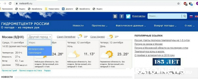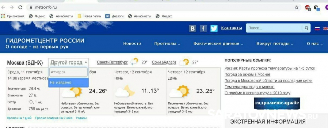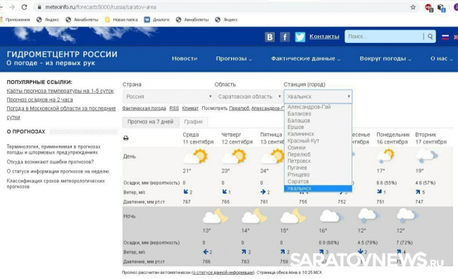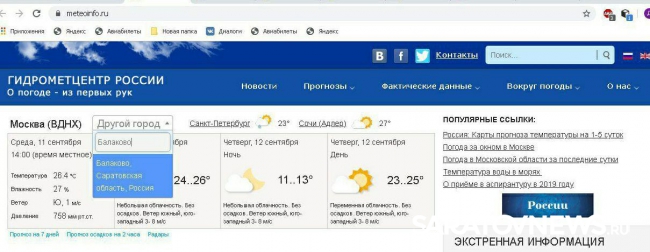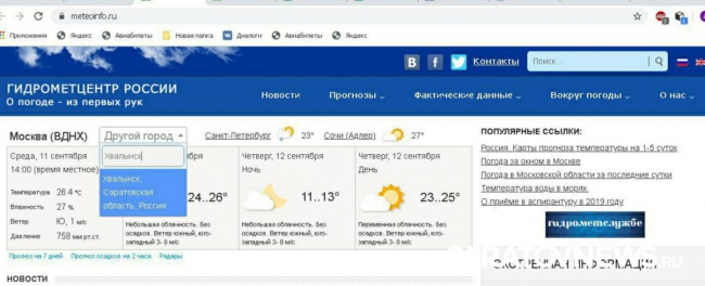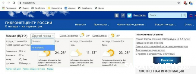 При этом если перейти на страницу с прогнозами, то там Саратов уже будет отображен, но почему-то некоторых крупных городов области, например, Энгельса, нет и там. Вероятно, это также связано с неисправной работой сайта.