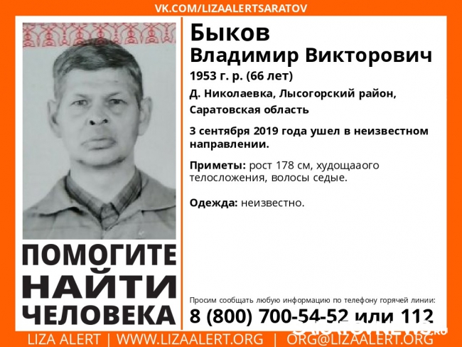В Лысогорском районе Саратовской области разыскивают 66-летнего Владимира Быкова, сообщают волонтеры поискового отряда «Лиза Алерт».