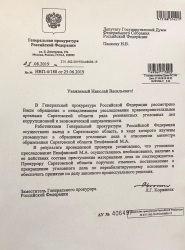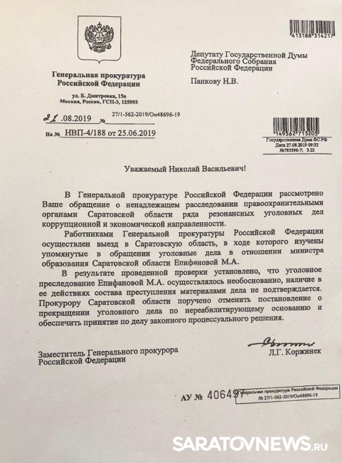 Депутату ГД ответили: уголовное преследование экс-министра было необоснованным, состава преступления в ее действиях нет. Поэтому прокурору Саратовской области поручили отменить постановление о прекращении уголовного дела против нее по нереабилитирующим основаниям и принять другое решение.