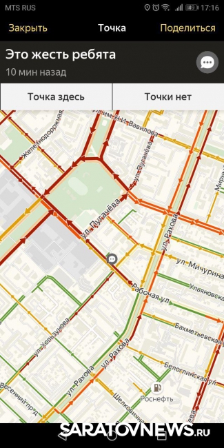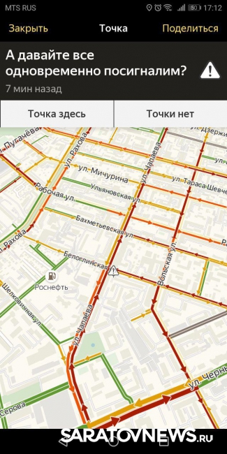 Придавить педаль газа в центре Саратова у автолюбителей тоже не выйдет. Скорость потока на всех крупных транспортных магистралях снижена до двух километров в час. Особенно трудно приходится сейчас тем, кто едет по Астраханской на всем ее протяжении, улице Рахова от Домов 8 Марта до улицы Кутякова и улице Чапаева от Ильинской площади до улицы Кутякова.