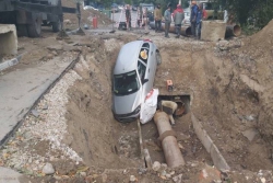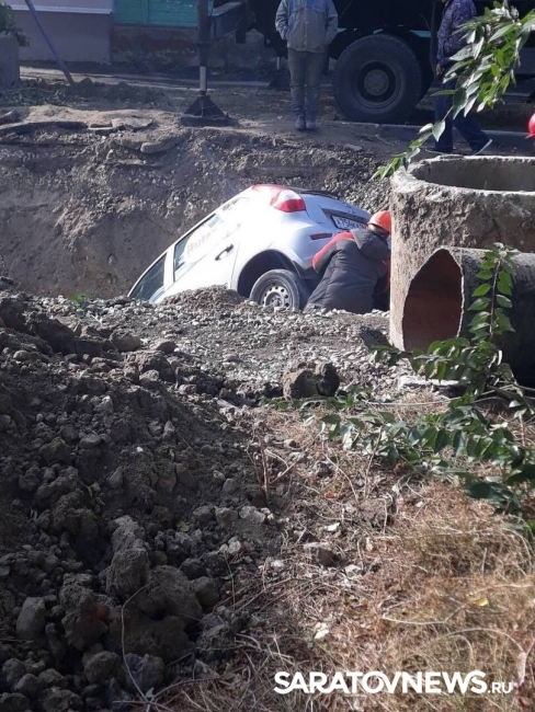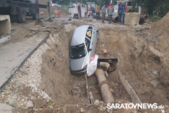 Сегодня в утренних сумерках в разрытую коммунальную яму на перекрестке улиц Горького и Зарубина в Саратове залетела Lada Kalina, брендированная в стиле фирмы Rutaxi. Информацию о происшествии SaratovNews подтвердили в городской ГИБДД.