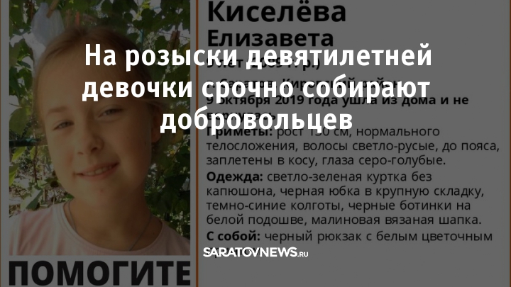 В Кировском районе Саратова через час начнутся поиски девятилетней Елизаветы Киселёвой. Девочка потерялась сегодня, об этом сообщил администратор отряда "Лиза Алерт Саратов" ВКонтакте.