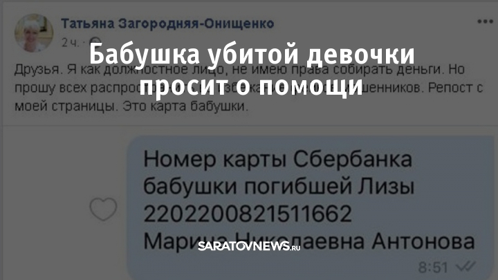 Уполномоченная по правам детей по Саратовской области Татьяна Загородняя опубликовала на своей странице в Facebook информацию о том, что семье погибшей в Саратове девятилетней девочки нужна материальная помощь.